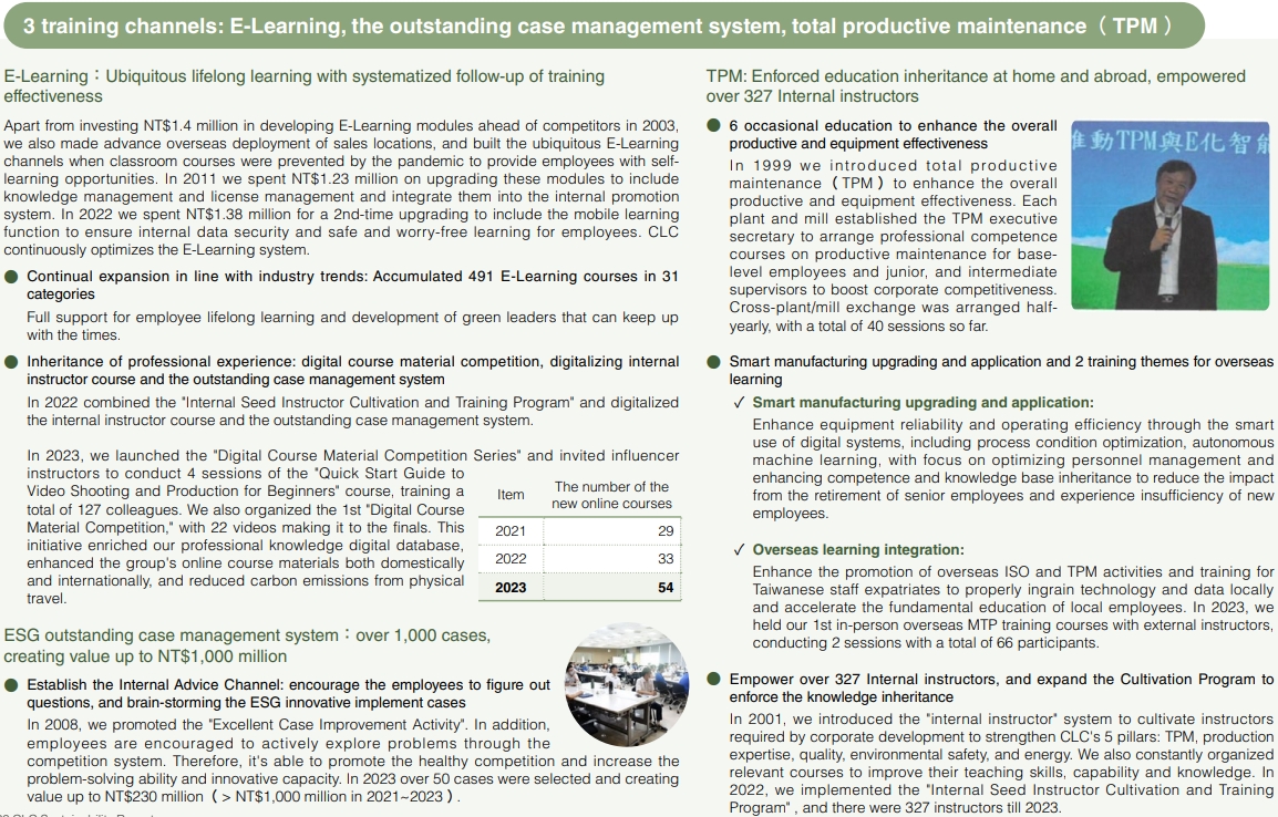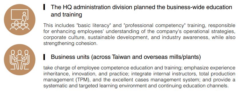 In 2020 we introduced the 10-Year Talents Empowerment Plan to respond to the group's implementation of the smart low-carbon paper plan in 2019. Based on the position and grade, contents were divided into fundamental competencies and professional competencies, focusing on technology and engineering, ESG governance, digital technology, crisis management, international languages, and digital talents management and evaluation system to promote total competence upgrading of employees through top-down implementation. In response to the trend in different fields, apart from dynamically setting targets and developing course contents for internal training and establishing long-term management and talents development plans for key positions, we also actively implement industry–academia collaboration, internship, and interdisciplinary programs, and run an internal academy to develop a steady sustainable talent pool for CLC and traditional industries. In 2023, we also revised the "Promotion and Managerial Position Allowance Adjustment Review Procedures," incorporating related courses such as "ESG Sustainable Management" and "Code of Ethical Conduct and Anti-Corruption Advocacy" as mandatory subjects for employee promotions to strengthen their ESG-related knowledge and adherence to ethical standards.