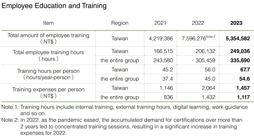 Set the minimum hours of learning for required professional training and training as time off in lieu to encourage employees to enrich professional competencies adaptively. In Taiwan area, the annual employee education/training was 249,036 hours (including E-Learning), and the per person training hour was 67.7 hours (+11.7 hours YoY) in 2023. For the entire group, the annual employee education/training was 335,690 hours, and the per person training hour was 54.6 hours (+9.6 hours YoY).