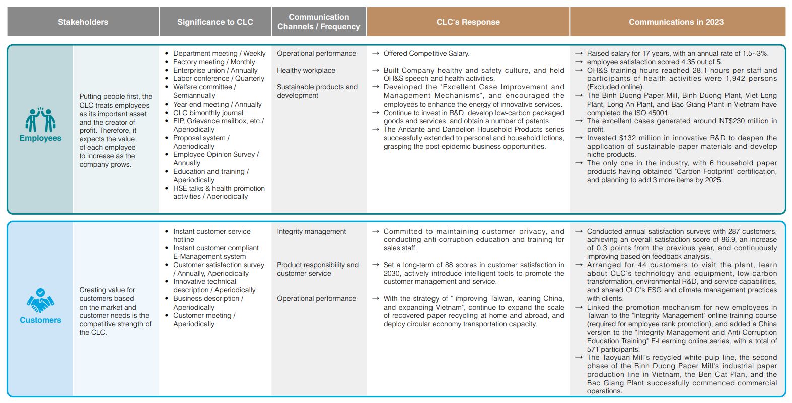 We believe that well communication with internal and external stakeholders is the prime mission of corporate accountability. Therefore, the Corporate Sustainability Committee holds the consensus meeting for sustainable development strategy and identifies stakeholders and material issues to provide important references disclosed in the sustainability report to meet all types of stakeholders' responses. In addition, we identified stakeholders and material issues from our senior management and Corporate Sustainability Committee. We collected responses from internal and external feedback on topics of concern to our ESG questionnaire every 3 years. The next one will be held in 2024.