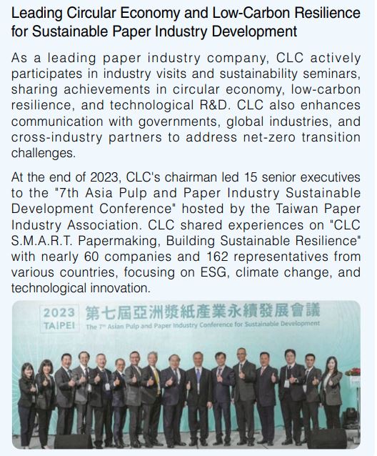 We develop low-carbon and plastic-free based on the principle of 3Rs to help the market realize green consumption and reduce waste. In addition to reducing the carbon footprint without lowering their protection performance through technology development, we enhance the efficiency of logistics and carbon reduction. In 2023, CLC also completed the 1st product carbon footprint inventory for industrial paper, ensuring that the low-carbon industrial paper manufactured by CLC's supply chain continues to be the preferred choice of major global companies.