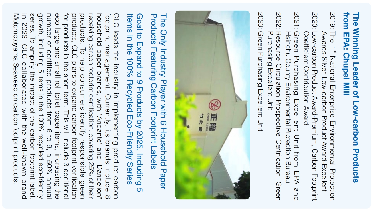 In 2009, CLC launched the "Dandelion" eco-friendly series, made from 100% recovered paper, and the 1st in the industry to use wind power for production. This series received the environmental label, carbon footprint certification, and FSCTM Recycled triple green certification, establishing it as Taiwan's leading eco-friendly household paper brand. To meet market demand, CLC extended its product line to the sub-brand "Pure Generation," with sales exceeding 70 million packs in 2023.