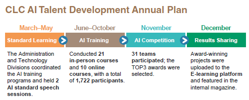In 2024, CLC implemented 9 in-person AI application courses (21 sessions) and 10 online courses, training 1,722 employees (nearly 50%) to strengthen AI technologies understanding and application. CLC held an AI Application Competition with 31 participating teams to promote practical AI integration and cross-departmental collaboration.