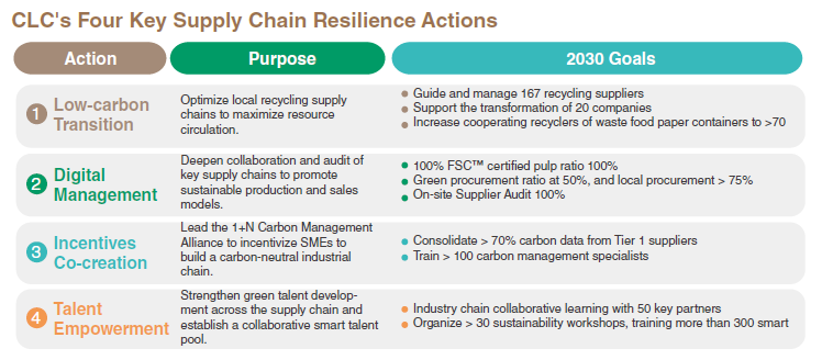Building and upgrading the industry talent pool is essential for international competitiveness in the era of sustainable low-carbon supply chains. CLC assessed supply chain transformation and implemented four resilience actions: Low-carbon, Digitalization, Incentives, and Empowerment. These actions supported supplier upgrades, enhanced local supplier resilience, expanded international order and nancing opportunities, and advanced the sustainable net-zero ecosystem.