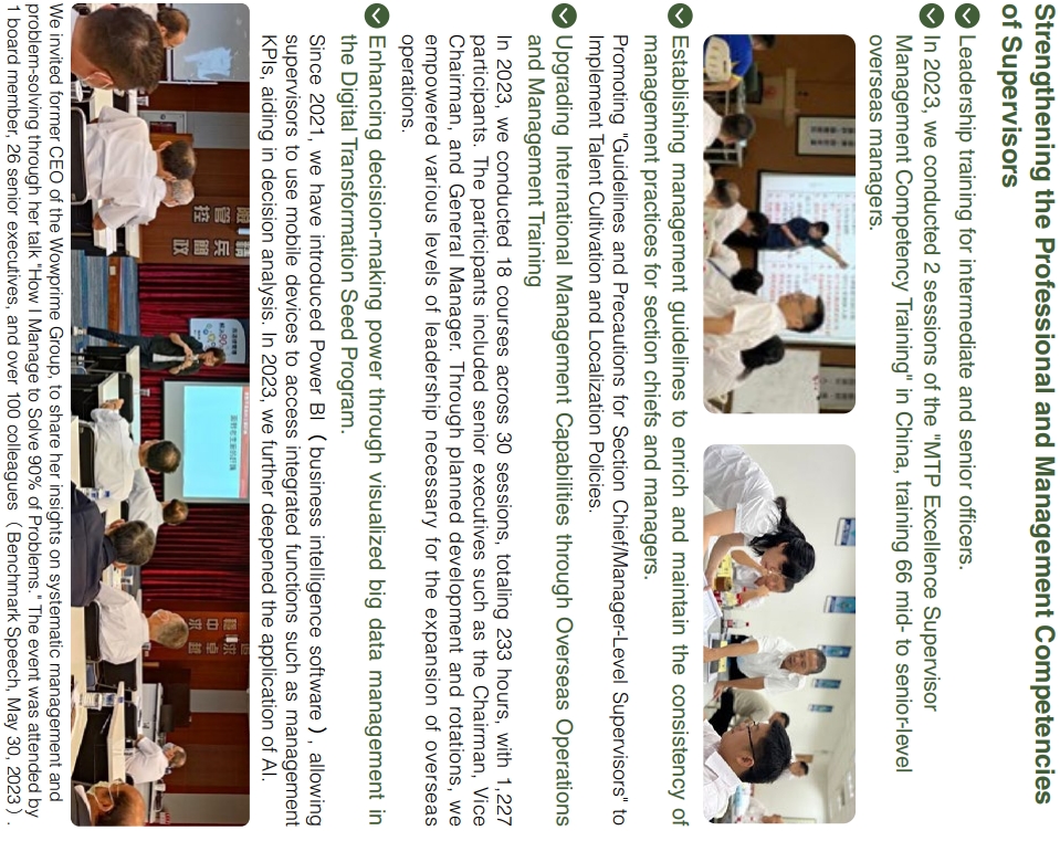 Moreover, we set building the local green leader pool as our macroscopic goal to enforce ESG talents development. We apply thematic education and training for intermediate and senior officers. In 2023, we focused on enhancing: team communication, establishment of management guidelines, supervisor job rotation, and digital decision-making applications. Additionally, we introduced digital management tools and built modularized management guidelines to ensure that supervisors engaging with overseas location expansion can maintain management at the same breadth and depth.