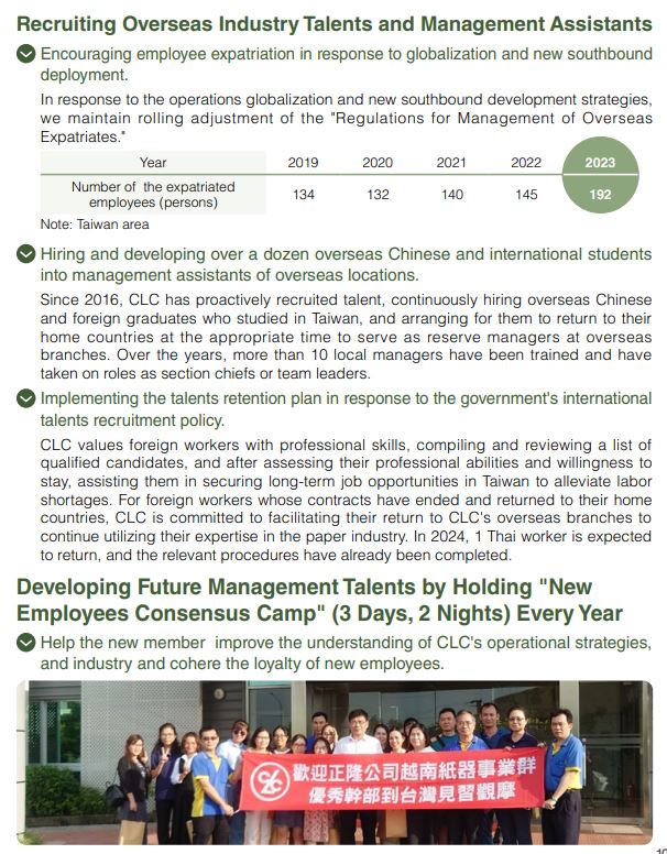 "Looking forward into overseas business deployment and the global trend of sustainable supply chain, we are promoting low-carbon smart paper transformation at full steam. Apart from enhancing the internal carbon reduction synergy through technology and operations, we emphasize the maximization of sustainable influence more. We also focus on developing green leaders that can keep up with the times, building a happy workplace featuring 'sense of honor,' 'sense of responsibility,' and 'sense of achievement' to incentivize and retain talents."