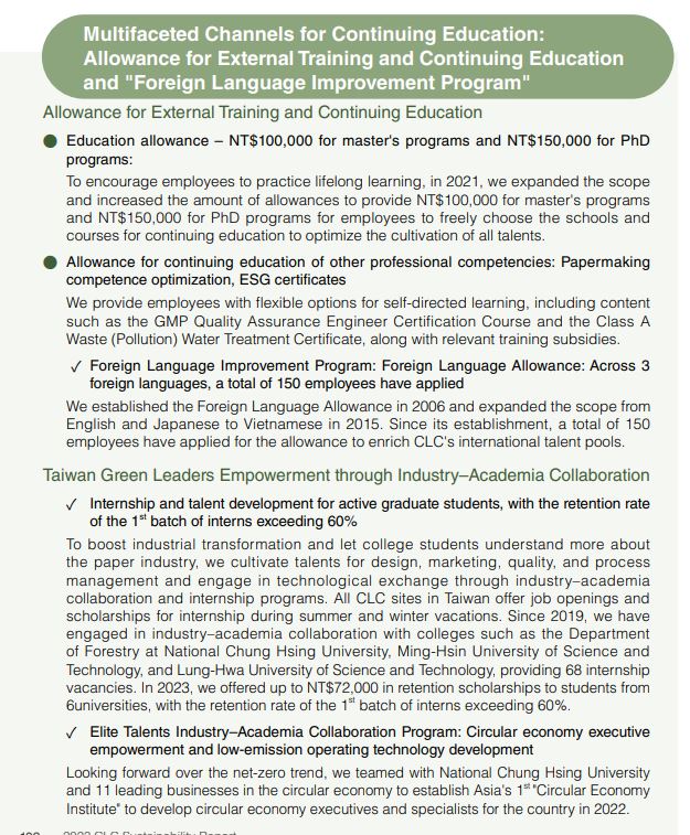 In 2020 we introduced the 10-Year Talents Empowerment Plan to respond to the group's implementation of the smart low-carbon paper plan in 2019. Based on the position and grade, contents were divided into fundamental competencies and professional competencies, focusing on technology and engineering, ESG governance, digital technology, crisis management, international languages, and digital talents management and evaluation system to promote total competence upgrading of employees through top-down implementation. In response to the trend in different fields, apart from dynamically setting targets and developing course contents for internal training and establishing long-term management and talents development plans for key positions, we also actively implement industry–academia collaboration, internship, and interdisciplinary programs, and run an internal academy to develop a steady sustainable talent pool for CLC and traditional industries. In 2023, we also revised the "Promotion and Managerial Position Allowance Adjustment Review Procedures," incorporating related courses such as "ESG Sustainable Management" and "Code of Ethical Conduct and Anti-Corruption Advocacy" as mandatory subjects for employee promotions to strengthen their ESG-related knowledge and adherence to ethical standards.