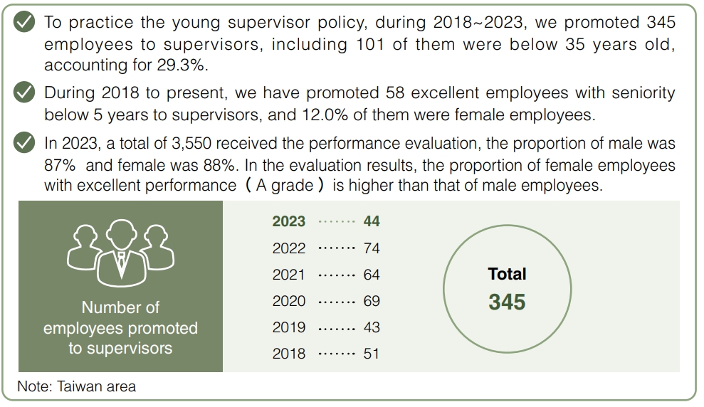 We value professional innovation and multifaceted inclusion and emphasize the inventory of the management and technology capabilities of key talents, and intermediate and senior officers. Additionally, we are committed to resolving the traditional labor-intensive and industry aging problems by actively promoting young and potential talents. We value the performance of female employees to build a gender-friendly workplace. With such, we aim to develop young and multifaceted officers.