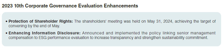 CLC emphasizes corporate governance and information transparency. Annual cross-departmental reviews of evaluation results set optimization goals and track progress to enhance governance mechanisms. From 2020 to 2024, CLC ranked in the TOP 6%~20% in Corporate Covernance Evaluation.