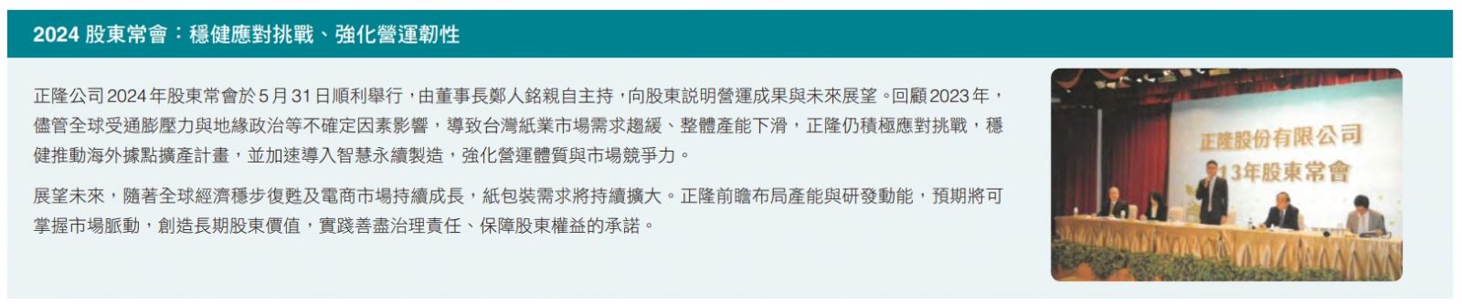為提升資訊揭露品質並加強與重要利害關係人的溝通,正隆於2024年度舉辦兩場線上法說會(分別於 3 月 28 日 與 8 月 16 日),由總經理、事業部主管及發言人向投資人與媒體報告營運概況、投資計畫、營業展望、ESG 策略、 風險管理及行動成果。此外,公司亦積極參與國內外各大ESG評比,藉此檢視並提升資訊揭露品質,確保與利害關係人之間的透明溝通與信任。